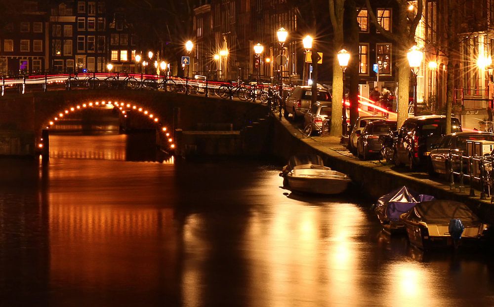 Verlichte grachten met bruggetjes en met mooie oude grachtenpanden in de hoofdstad Amsterdam in Nederland.