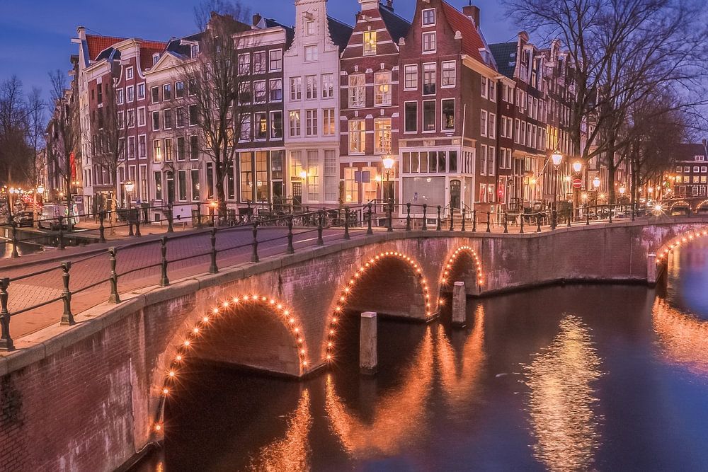 Amsterdam bij nacht. Een beeld van de hoek Keizersgracht en Leidsegracht. Aan de linkerzijde zie je in de verte de Westerkerk. Bij het maken van deze foto in de avond zijn de bruggen en straatlantaarns mooi verlicht. Een mooi stadsgezicht van onze hoofdstad.