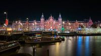 Nachtfotografie bij het centraal station van Amsterdam. De verlichting van de gebouwen reflecteert in het water.