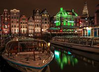 een prachtige avondplaat op het Damrak in Amsterdam. De beroemde huisjes aan de Damrak staan eigenlijk op de Warmoestraat. De achterkant grenst aan het water op het Damrak.