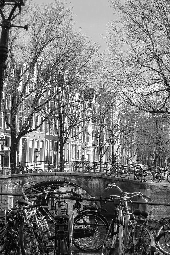 Deze zwart-wit foto brengt de iconische elementen van Amsterdam op een tijdloze manier samen: de karakteristieke grachtenpanden, de sfeervolle grachten en de alomtegenwoordige fietsen. Het contrast tussen licht en schaduw geeft diepte aan de historische gebouwen, terwijl de fietsen een dynamisch en authentiek beeld van het Amsterdamse stadsleven creëren. Zonder kleur komt de architectuur en het straatbeeld nog krachtiger naar voren, wat zorgt voor een serene en nostalgische uitstraling. Voor liefhebbers van stedelijke fotografie is deze foto een prachtige toevoeging aan uw interieur, een kunstwerk dat de essentie van Amsterdam op een unieke en elegante manier vastlegt.