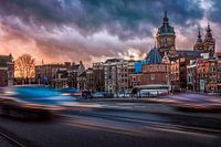 Tijdens de zonsondergang bewegend verkeer door middel van een langesluitertijd . Het kruispunt van de Prins hendrikkade, Met zicht op de Basiliek van de Heilige Nicolaas.