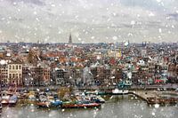 Zicht van bovenaf op Amsterdam. De Prins Hendrikkade en daarachter het centrum met de Westertoren in de sneeuw.