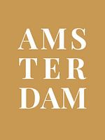 Tijdloze typografie poster "AMSTERDAM" in gouden achtergrond, witte tekst