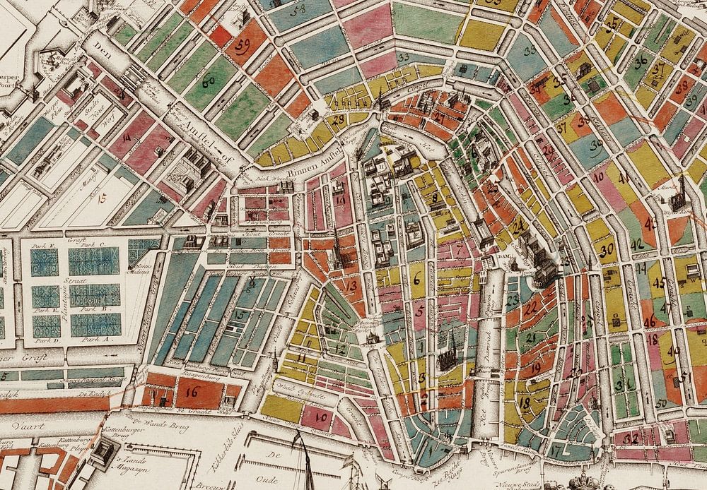 Oude kaart, gedetailleerde oude stadsplattegrond, wegenkaart of plattegrond en index van vestingstad Amsterdam uit de 18e eeuw met veel straatnamen.