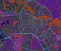Gedetailleerde plattegrond, wegenkaart of stratenkaart van Amsterdam in Holland, Nederland in negatief met het centrum, alle wegen als de ring, parken, haven en watertjes als de Amster en het IJ met oranje, paars en blauw