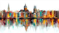 Amsterdam, kerktorens, weerspiegeling, olieverfschilderij, oude stad, panorama, architectuur, water, kleuren, huizen, weerspiegeling, Nederland, stadsgezicht, koepels, schilderij, grachten, gebouwen, gevels, romantiek, impressionisme, landschap, toerisme, historisch, sfeer, decoratie, illustratie, expressief, Nederland, skyline, schilderij