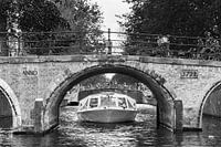 Prachtige foto van een rondvaartboot die onder een brug doorvaart in de grachten van Amsterdam in zwart-wit