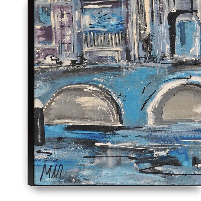 Amsterdamse sfeer met oude herenhuizen ,de gracht en grachtenpanden met grachtengordel .Met daarin de tram die door de stad rijd. Een hedendaags figuratief schilderij in blauw kleurenpalet geschilderd .