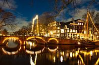 Amsterdam verlicht klassieke zeilboten in de binnenstad aan de Prinsengracht en Brouwersgracht met een kerstsfeer.