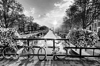 Prachtig typerend zomers beeld van een brug met fietsen en bloemen in Amsterdam tijdens zonsopkomst in zwart-wit
