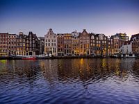 Amsterdam, zonsondergang aan de gracht met zicht op veel grachten panden, geen mensen zichtbaar
