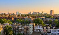 Prachtige opname van de skyline van Amsterdam kijkend richting de wolkenkrabbers en kantoren op de Zuid-as tijdens zonsondergang