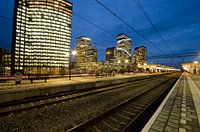 Treinstation Amsterdam Zuid met op de achtergrond de kantoren van het financiële centrum met als opvallend gebouw het hoofdkantoor van de ABN Amro op de zogenoemde zuidas. De forensen staan te wachten op hun trein en lijken het fascinerende lichtspel niet te zien