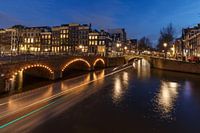 De grachten van Amsterdam in de avond, een rondvaartboot vaart ook voorbij. De lichtjes van de brug geven een extra leuk gevoel.