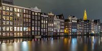 De pakhuizen aan de gracht. In de de achtergrond nog de toren van de Zuiderkerk. Verlichting van de ramen weerspiegelen in het water van de Damrak.