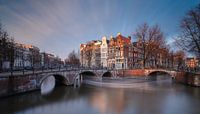 Amsterdamse Keizersgracht een rondvaartboot komt voorbij de mooie blauwe avond lucht en de door de avondzon verlichte grachtenpanden