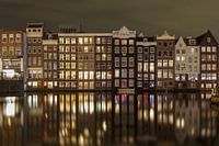 Grachtenpanden aan het Rokin, de lichten uit de kamers weerschijnen het kalme water. De oude panden staan op houten palen in het water en dat al zo'n 800jaar