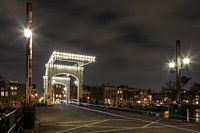 De magere brug vlak bij Carré, met al zijn lichtjes een mooi schouwspel in de avond. De fietsers met verlichting gaan de brug over wat de strepen in het beeld veroorzaakt.