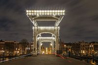 De magere brug vlak bij Carré, met al zijn lichtjes een mooi schouwspel in de avond. De fietsers met verlichting gaan de brug over wat de strepen in het beeld veroorzaakt.