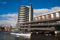 Dit fotografische stadsgezicht met rondvaartboten in Amsterdam en de grootste parkeergarage voor fietsen is een indrukwekkend voorbeeld van moderne, stedelijke motieven in Europa.