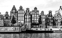 Deze sfeervolle zwart-wit foto toont het iconische grachtwater van Amsterdam op de voorgrond, met daarachter de typische grachtenpanden. De compositie en het spel van licht en schaduw benadrukken de historische charme en architectonische schoonheid van de stad. De foto nodigt de kijker uit om de tijdloze elegantie van Amsterdam te waarderen. Perfect voor liefhebbers van stadsfotografie en historische architectuur.
