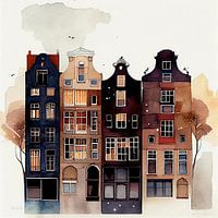 Dit waterverf schilderij is een prachtige weergave van de charmante architectuur van Amsterdam. Het toont de grachtenpanden in vrolijke en aardse kleuren. Het minimalistische ontwerp benadrukt de elegantie van het gebouw en de rijke details, en zorgt voor een opvallende aanvulling op elke muur. Dit schilderij is een prachtige ode aan de historische schoonheid van de stad Amsterdam.