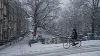 Fietsen door Amsterdam terwijl het sneeuwt is niet zonder gevaar; de bruggetjes kunnen glad zijn, dus hopelijk is deze fietser zonder te vallen veilig thuis gekomen.