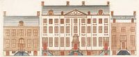 Tekening, illustratie of prentkunst met grachtenpanden te Amsterdam, naar inspiratie op Johan Teyler. Huizen aan de grachtengordel, statige herenhuizen aan gracht.