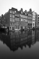 Een rijtje scheve huizen in Amsterdam centrum langs een gracht. Foto gemaakt met een lange sluitertijd om de reflectie van de huizen in de gracht te kunnen zien.