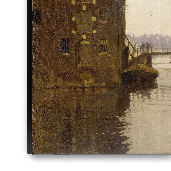 Stadsgezicht met pakhuizen aan een Amsterdamse gracht op Uilenburg. Rechts een ijzeren ophaalbrug, een platte schuit ligt aangemeerd bij het pakhuis.