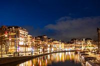 Amsterdamse verlichte kade aan het Rokin tijdens een winteravond in het centrum van de grachtengordel. De maan schijnt in de donkere avondlucht.