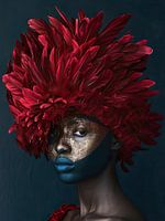 Een levendig portret, doordrenkt met gouden, karmozijnrode en blauwe tinten, belicht bizarre en surrealistische elementen. Inspiratie uit Amy Judd's stijl is duidelijk zichtbaar, met afrofuturistische accenten die de verbeelding prikkelen. Het beeld straalt een bijzondere harmonie uit, waar kleuren dansen en ongewone vormen samenkomen, waardoor een boeiend en mysterieus schouwspel ontstaat.