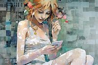 Ze kijkt op haar telefoon. Waar is ze mee bezig? Een Whatsapp naar een geliefde? Een blik op Instagram? Filmpje op TikTok? Of haar spannende boek aan het lezen?