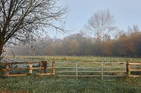Dieses Farbfoto zeigt eine idyllische Landschaft in einem frühen, kühlen Morgenlicht, das die Szene in eine sanfte und ruhige Stimmung taucht. Im Vordergrund befindet sich ein rustikaler Holzzaun, der mit einem modernen, silbernen Metalltor verbunden ist. Das Holz des Zauns zeigt deutliche Spuren der Witterung und wirkt durch seine rauen Oberflächen authentisch und geerdet. Über das linke Ende des Zauns hängt ein dunkelbraunes Kleidungsstück, das einen interessanten menschlichen Bezugspunkt in die ansonsten naturbelassene Szenerie einfügt.