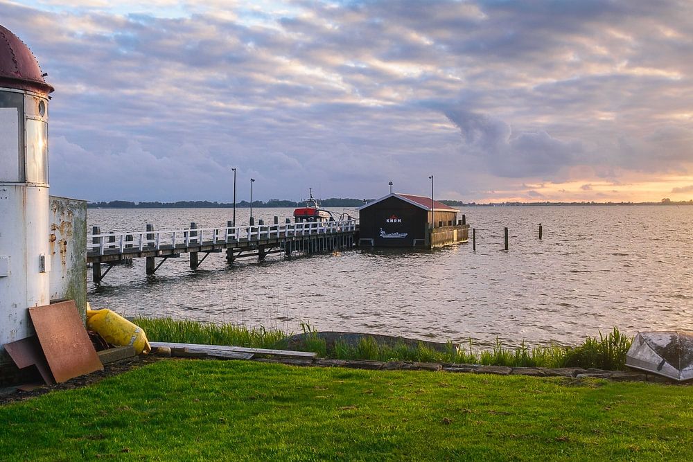 In de haven van Marken staat op het terrein van het KNMR reddingsstation deze kleine vuurtoren. Het vormt een prachtig onderwerp voor een foto. De ondergaande zon en het fraaie wolkendek geven het geheel aan aangename droomachtige sfeer.
