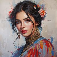 Een levendig gemengd medium van een prachtig kunstwerk van een vrouw met een grote verscheidenheid aan kleuren, delicate lijnen, subtiele kleurovergangen en rijke toonwaarden. Het nodigt de kijker uit om de schoonheid van kunst in al haar vormen te ontdekken en waarderen.