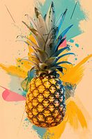 Dompel jezelf onder in de wereld van abstract expressionisme met deze kleurrijke afbeelding van een ananas. Dit kunstwerk combineert felle kleuren zoals geel, oranje en turquoise met dynamische penseelstreken en spatten. De focus ligt op de gedetailleerde ananas, die afsteekt tegen een levendige, abstracte achtergrond. Ideaal voor moderne woonruimtes of kantoren die op zoek zijn naar een creatief en kleurrijk accent. Perfect voor kunstliefhebbers en fans van abstract expressionisme.