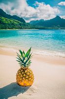 Een sappig symbool van tropische levensvreugde rust zachtjes in het warme zand, omringd door helderblauw water en majestueuze bergen. Deze levendige ananas straalt een vakantiestemming uit en doet verlangen naar zonnige stranden. Perfect voor in de keuken of woonkamer, het brengt een vleugje exotisme en frisheid in elke kamer.