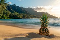 Een tropische droom ontvouwt zich met een ananas tronend in het gouden zand, terwijl zachte golven op de achtergrond spelen. De indrukwekkende achtergrond van de bergen schetst een beeld van rust en avontuur. Dit kunstwerk brengt een vrolijke, zomerse flair in elke woonkamer en straalt een pure vakantiestemming uit!
