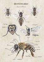 Anatomie van de Honingbij van buiten. Hoe ziet de bij er uit en wat is het verschil tussen werkster, dar en koningin. Illustraties Jasper de Ruiter
