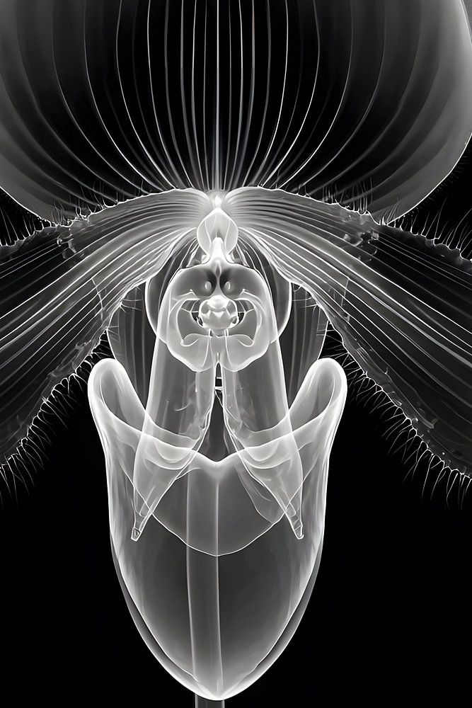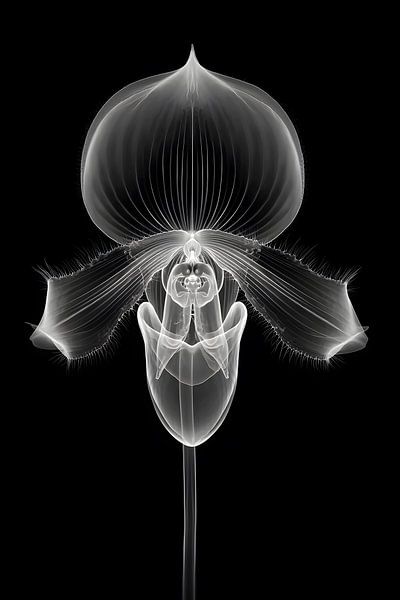 Een orchidee lijkt doorschijnend: transparante bloemblaadjes, fijne nervenstructuren en een filigraan hart steken in lichtgrijs af tegen de diepzwarte achtergrond. De symmetrie oogt bijna wetenschappelijk nauwkeurig, terwijl de zachte overgangen een fragiele elegantie behouden. Het beeld combineert botanische schoonheid met een…