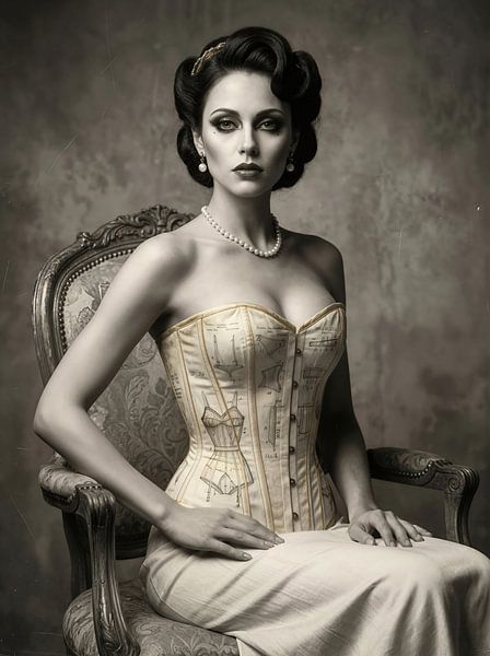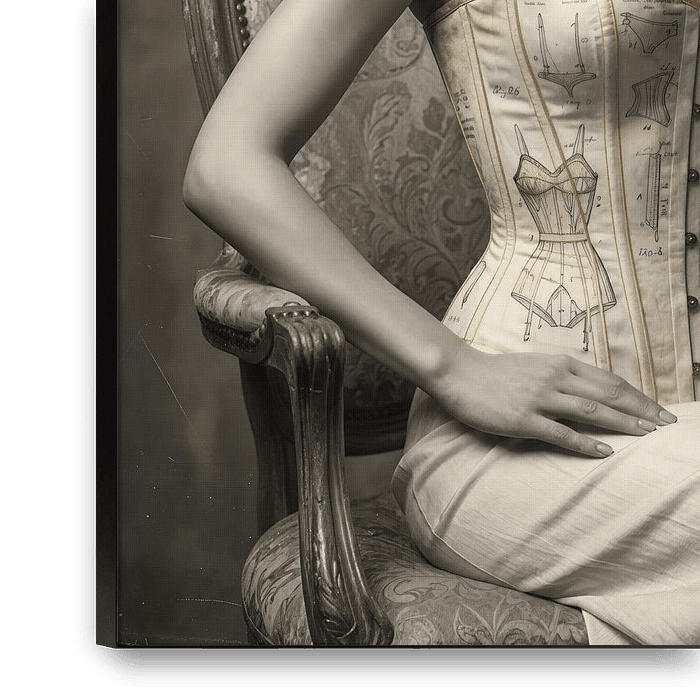 Het lichaam is frontaal gericht, de houding rustig, de lijnen helder. Het korset is niet decoratief, maar functioneel - bijna didactisch. Tekeningen, markeringen en constructies op de stof doen denken aan bouwtekeningen. Niet voor kleding,…