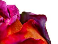 Een oudere rode roos met bijzondere kleuren schakeringen. De scherpte ligt op het kleine mooie krulletje in de bloembladeren. Dit alles is mooi gepositioneerd tegen een witte achtergrond.