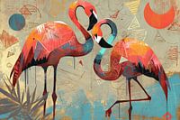 Ancient Echoes Unfold - Dit dieren schilderij toont twee kleurrijke flamingo's, verrijkt met een wirwar van abstracte patronen en tribale motieven tegen een getextureerde achtergrond die herinnert aan oude muurschilderingen.