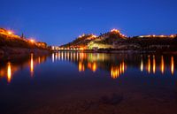 Andalusië, Spanje met het dorp Iznájar op de top van een heuvel. Het landschap weerspiegelt in het meer van Iznájar. De foto is genomen tijdens de avond schemering. Het dorp is één van de meest karakteristieke en prachtige historische dorpen in deze zuidelijkste spaanse regio.