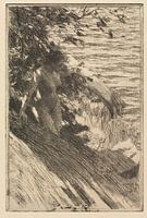 Anders Zorn (1860-1920) was een Zweedse schilder, beeldhouwer en graficus van het einde van de 19e en het begin van de 20e eeuw. Bekend om zijn virtuoze techniek, vooral in het aquarelleren, maakte Zorn indrukwekkende portretten, naakten en landschappen. Zijn werken weerspiegelen realisme en een levendige weergave van het menselijk leven, waarbij hij vaak meesterlijk gebruik maakt van het spel van licht en schaduw. Zorn werd internationaal erkend en genoot grote populariteit, zowel in de kunstwereld als in de maatschappij van zijn tijd.