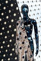 Een dubbele belichting van een etalagepop en een deel van het dak van Museum Kade in Amersfoort.