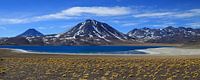 Panorama van een lagune hoog in het Andes gebergte nabij de Atacama woestijn. op de achtergrond zie je een vulkaan.