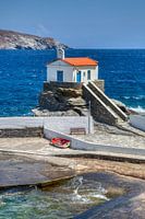 Uitzicht van bovenaf op kleine witte kerk op het strand, Andros, Cycladen, Griekenland